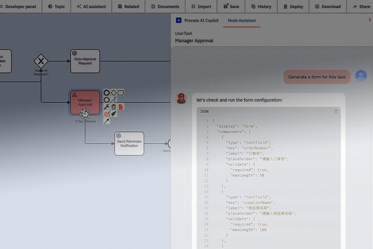 It not only generates complete workflows, but also assists at the node level — creating configurations, technical specs, and documentation that span the entire process lifecycle, from design to deployment.
